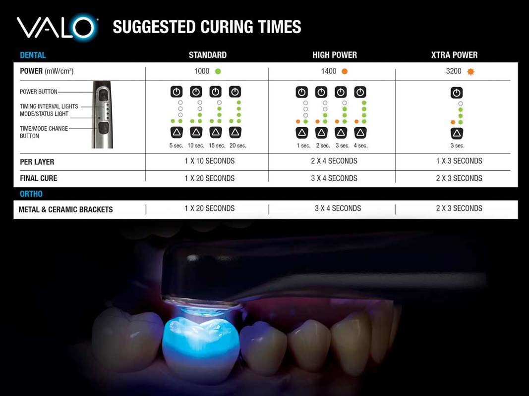 Đèn trám quang trùng hợp không dây VALO sử dụng đèn LED đa bước sóng có thể tùy chỉnh để tạo ra ánh sáng cường độ cao ở 385-515nm, có khả năng trùng hợp tất cả các vật liệu nha khoa quang trùng hợp. Cường độ này có thể xuyên qua sứ và có khả năng trùng hợp xi măng nhựa ở bên dưới giống như một đèn halogen chất lượng.